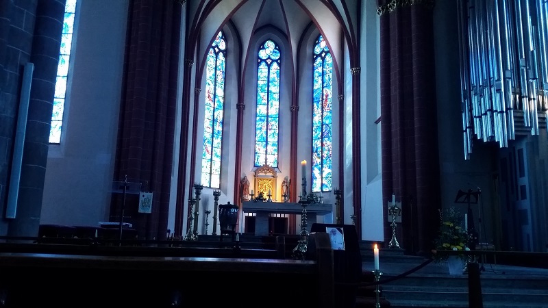 Wer noch gut zu Fuß ist, kann eigenständig auf Tour gehen: St. Stephan Mainz, die katholische Kirche mit Buntglasfenstern von Marc Chagall und mit spätgotischem Kreuzgang. |