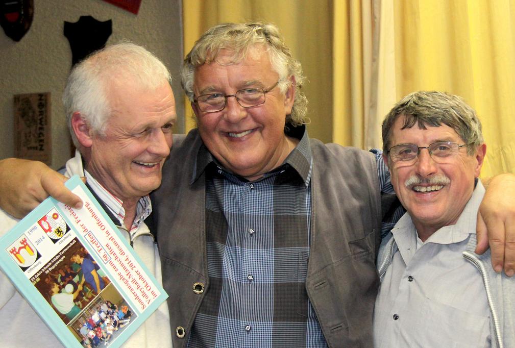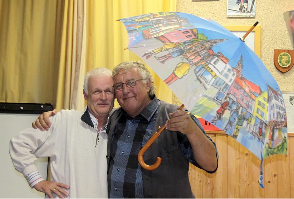 Erinnerungsgeschenke werden überreicht, ein Fotobuch über die letzten 25 Jahre und ein Offenburg-Schirm.
